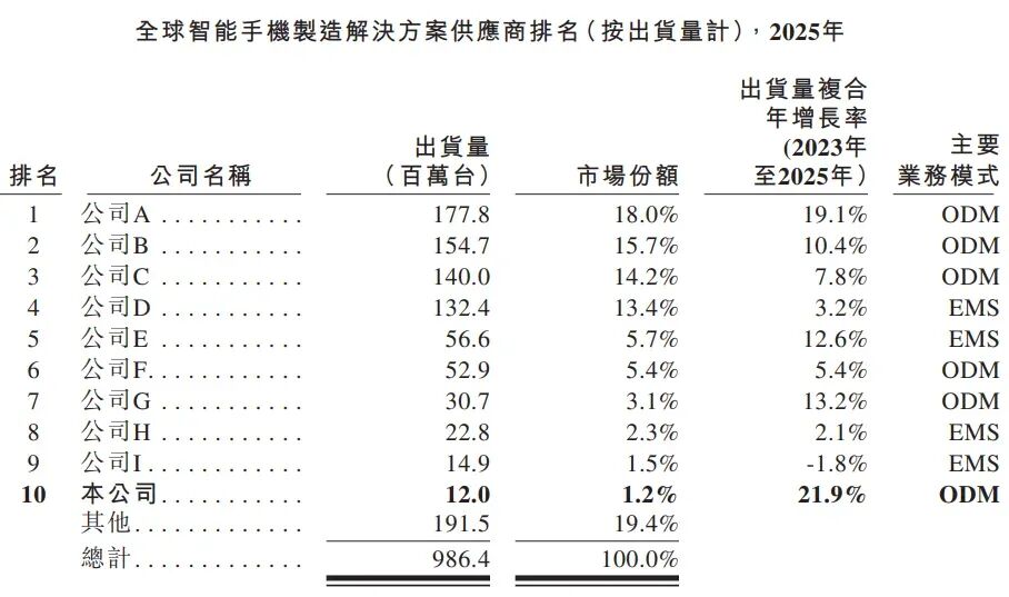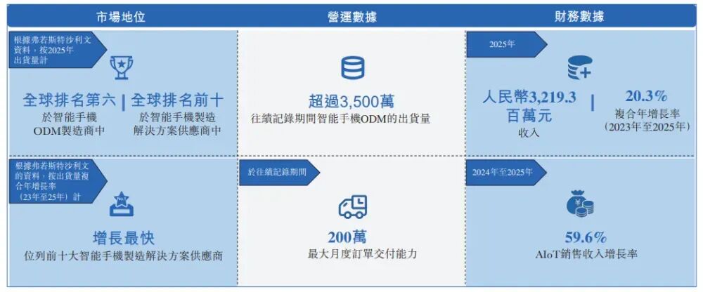 根据弗若斯特沙利文的资料,于2025年,按ODM出货量计,公司在全球智能手机ODM制造商中排名第六。据同一消息来源,按2023年至2025年的出货量复合年增长率计,公司亦是十大智能手机制造解决方案提供商中增长最快的提供商。