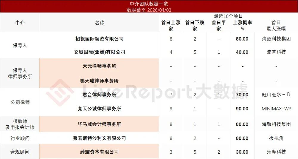 据LiveReport大数据统计,易景信息中介团队共计9家,其中保荐人2家,近10家保荐项目数据表现普通;公司律师共计2家,综合项目数据表现尚可。整体而言中介团队历史数据表现中规中矩。