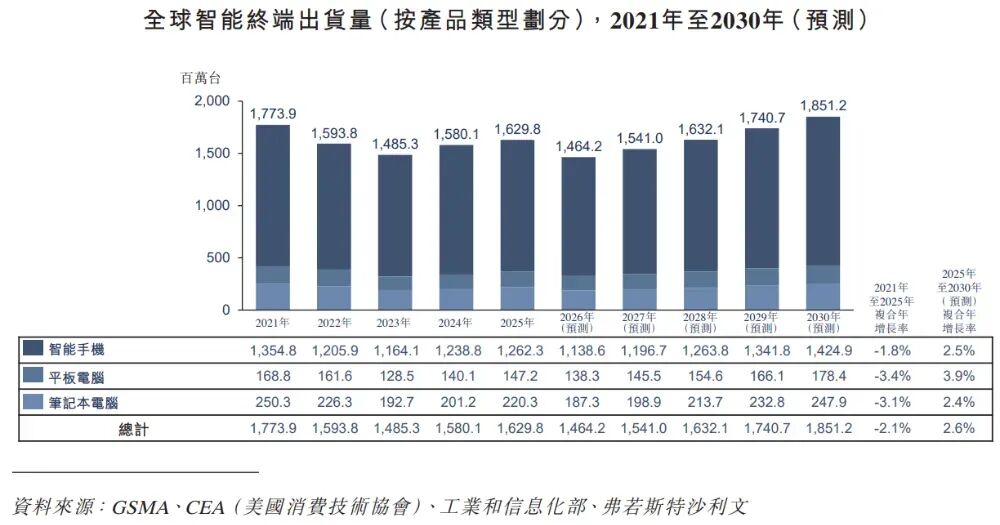 根据弗若斯特沙利文(Frost & Sullivan)的报告,市场于2024年显示出明显的复苏迹象,并于2025年恢复稳定增长,全球总出货量从1,580.1百万台增加至1,629.8百万台。在技术创新及政策支持的驱动下,预计市场将保持稳定增长。总出货量将由2025年的1,629.8百万台增至2030年的1,851.2百万台,预测期内的复合年增长率约为2.6%。
