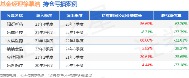 徐慕浩管理的泰信竞争优选混合基金在21年4季度买入昭衍新药,在持有2年又0个季度后在23年4季度卖出。持有期间的估算收益率为-62.2%,持有期间昭衍新药在2021年到2023年的年报营业总收入增幅达56.69%。