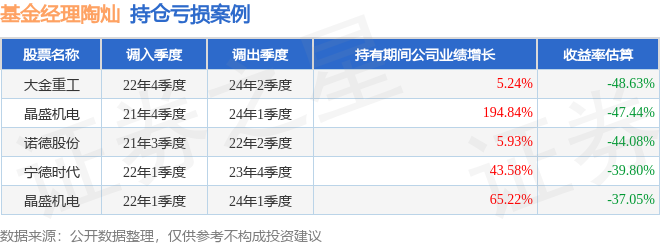 陶灿管理的建信新能源行业股票A基金在22年4季度买入大金重工,在持有1年又2个季度后在24年2季度卖出。持有期间的估算收益率为-48.63%,持有期间大金重工在2022年到2024年的年报归属净利润增幅达5.24%。