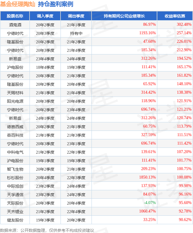 陶灿管理的建信改革红利股票A基金在23年2季度买入中际旭创,在持有1年又2个季度后在24年4季度卖出。持有期间的估算收益率为99.98%,持有期间中际旭创在2023年到2024年的年报归属净利润增幅达137.93%。
