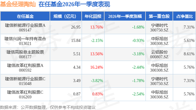 证券之星消息,截止2026年一季度末,基金经理陶灿旗下共管理6只基金,本季度表现最佳的为建信兴润一年持有混合(013021),季度净值跌0.93%。