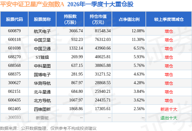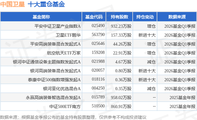 根据2026基金Q1季报公募基金重仓股数据,重仓该股的公募基金共8家,其中持有数量最多的公募基金为平安基金的平安中证卫星产业指数A。平安中证卫星产业指数A目前规模为1.53亿元,最新净值1.2998(4月20日),较上一交易日上涨4.38%。该公募基金现任基金经理为翁欣 马浩然。翁欣在任的基金产品包括:港股医药ETF平安,管理时间为2023年12月15日至今,期间收益率为35.47%;平安中证港股医药ETF联接A,管理时间为2023年12月27日至今,期间收益率为42.76%;养殖ETF平安,管理时间为2023年12月27日至今,期间收益率为-1.77%;医疗创新ETF平安,管理时间为2023年12月27日至今,期间收益率为-11.16%。马浩然在任的基金产品包括:平安中证新能车ETF联接A,管理时间为2025年10月20日至今,期间收益率为16.39%;平安中证光伏产业指数A,管理时间为2025年10月20日至今,期间收益率为17.51%;平安中证汽车零部件主题ETF联接A,管理时间为2025年10月20日至今,期间收益率为2.49%;汽车零部件ETF平安,管理时间为2025年10月20日至今,期间收益率为2.87%。