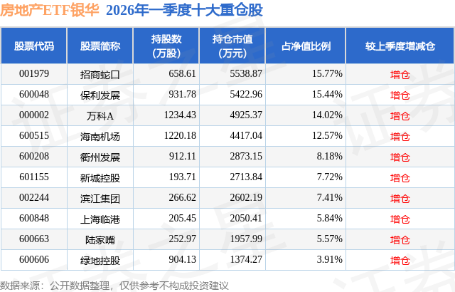 房地产ETF银华的前十大重仓股如下: