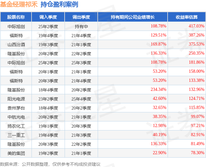 祁禾管理的易方达环保主题混合A基金在25年2季度买入中际旭创,已连续持有3个季度。持有期间的估算收益率为417.03%,持有期间中际旭创在2024年到2025年的年报归属净利润增幅达108.78%。