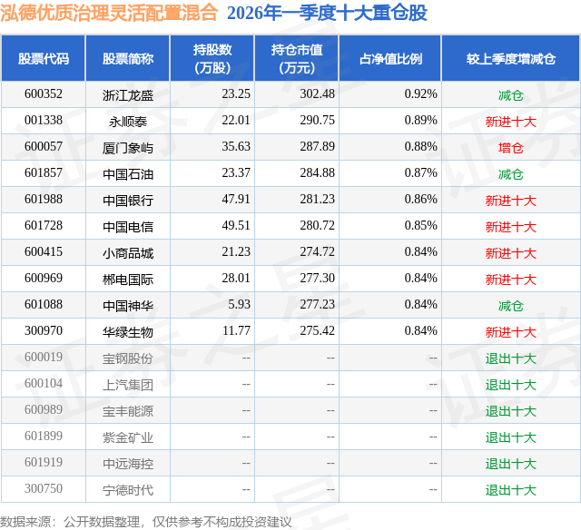 泓德优质治理灵活配置混合的前十大重仓股如下: