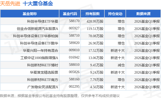 根据2026基金Q1季报公募基金重仓股数据,重仓该股的公募基金共15家,其中持有数量最多的公募基金为华夏基金的科创半导体ETF华夏。科创半导体ETF华夏目前规模为80.79亿元,最新净值1.7498(4月21日),较上一交易日下跌0.73%,近一年上涨75.59%。该公募基金现任基金经理为杨斯琪。杨斯琪在任的基金产品包括:红利低波ETF华夏,管理时间为2024年6月11日至今,期间收益率为12.26%;华夏中证红利低波动ETF发起式联接A,管理时间为2024年7月2日至今,期间收益率为12.14%;华夏中证全指运输ETF发起式联接A,管理时间为2024年11月7日至今,期间收益率为2.77%;交通运输ETF华夏,管理时间为2024年11月7日至今,期间收益率为3.16%。
