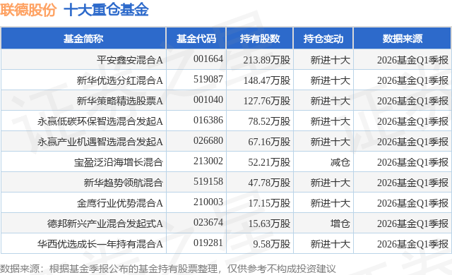 根据2026基金Q1季报公募基金重仓股数据,重仓该股的公募基金共15家,其中持有数量最多的公募基金为平安基金的平安鑫安混合A。平安鑫安混合A目前规模为2.18亿元,最新净值2.842(4月21日),较上一交易日下跌0.84%,近一年上涨124.49%。该公募基金现任基金经理为林清源。林清源在任的基金产品包括:平安鼎越混合(LOF),管理时间为2023年11月13日至今,期间收益率为171.91%;平安港股通科技精选混合A,管理时间为2025年9月2日至今,期间收益率为11.78%;平安产业竞争力混合A,管理时间为2025年12月23日至今,期间收益率为11.53%。