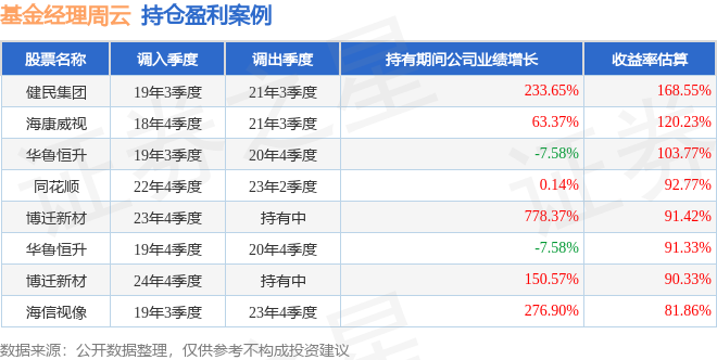 周云管理的东方红新动力混合A基金在19年3季度买入健民集团,在持有2年又0个季度后在21年3季度卖出。持有期间的估算收益率为168.55%,持有期间健民集团在2019年到2021年的年报归属净利润增幅达233.65%。