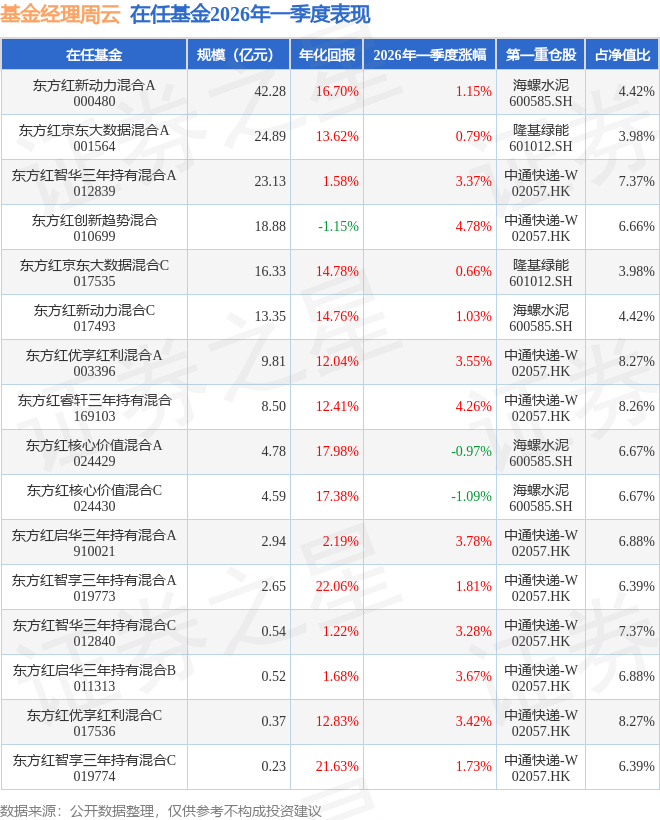 证券之星消息,截止2026年一季度末,基金经理周云旗下共管理16只基金,本季度表现最佳的为东方红创新趋势混合(010699),季度净值涨4.78%。