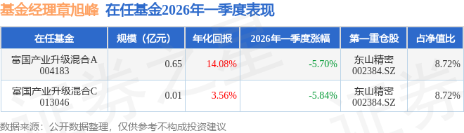 证券之星消息,截止2026年一季度末,基金经理章旭峰旗下共管理2只基金,本季度表现最佳的为富国产业升级混合A(004183),季度净值跌5.7%。