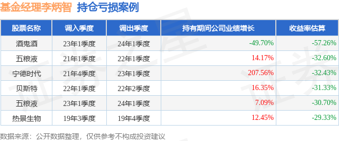 李炳智管理的前海开源鼎瑞债券A基金在23年1季度买入酒鬼酒,在持有1年又0个季度后在24年1季度卖出。持有期间的估算收益率为-57.26%,持有期间酒鬼酒在2023年到2024年的年报营业总收入降幅为49.7%。
