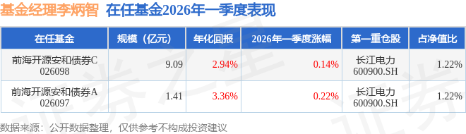 证券之星消息,截止2026年一季度末,基金经理李炳智旗下共管理2只基金,本季度表现最佳的为前海开源安和债券A(026097),季度净值涨0.22%。