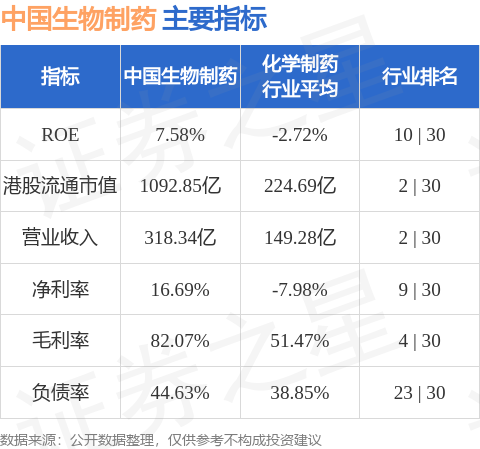 中国生物制药港股市值1092.85亿港元,在化学制药行业中排名第2。主要指标见下表: