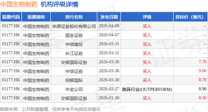 截至2026年4月23日收盘,中国生物制药(01177.HK)报收于5.59港元,下跌4.12%,成交量9477.97万股,成交额5.34亿港元。投行对该股的评级以买入为主,近90天内共有8家投行给出买入评级,近90天的目标均价为8.56港元。华源证券股份有限公司最新一份研报给予中国生物制药买入评级。
