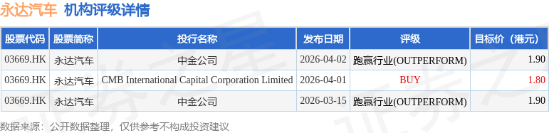 截至2026年4月23日收盘,永达汽车(03669.HK)报收于1.09港元,下跌3.54%,成交量495.2万股,成交额541.45万港元。投行对该股的评级以跑赢行业(OUTPERFORM)为主,近90天内共有2家投行给出跑赢行业(OUTPERFORM)评级,近90天的目标均价为1.87港元。中金公司最新一份研报给予永达汽车跑赢行业(OUTPERFORM)评级,目标价1.9港元。