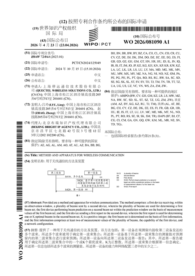 证券之星消息,根据企查查数据显示移远通信(603236)公布了一项国际专利申请,专利名为“用于无线通信的方法及装置”,专利申请号为PCT/CN2024/125049,国际公布日为2026年4月23日。