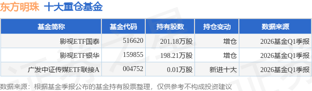 根据2026基金Q1季报公募基金重仓股数据,重仓该股的公募基金共3家,其中持有数量最多的公募基金为国泰基金的影视ETF国泰。影视ETF国泰目前规模为2.61亿元,最新净值1.0032(4月24日),较上一交易日下跌2.29%,近一年上涨6.66%。该公募基金现任基金经理为王玉。王玉在任的基金产品包括:国债ETF国泰,管理时间为2019年12月25日至今,期间收益率为20.15%;十年国债ETF国泰,管理时间为2019年12月25日至今,期间收益率为27.45%;国泰信用互利债券A,管理时间为2020年3月13日至今,期间收益率为18.72%;国泰中债1-3年国开债A,管理时间为2020年8月27日至今,期间收益率为18.07%。