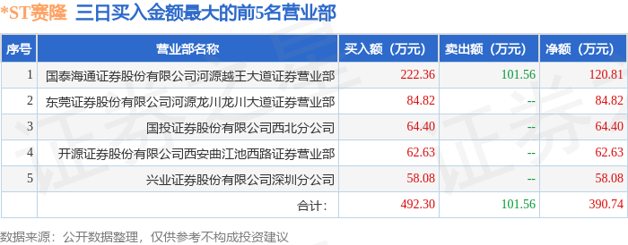 证券之星消息,沪深交易所2026年4月29日公布的交易公开信息显示,*ST赛隆(002898)因连续三个交易日内,跌幅偏离值累计达到12%的ST证券、*ST证券和未完成股改证券登上龙虎榜。此次是近5个交易日内第2次上榜。