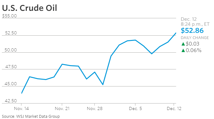 (美国原油价格走势,12月12日报收52.86元/桶)