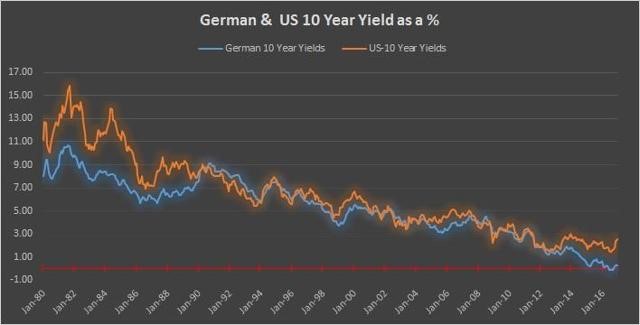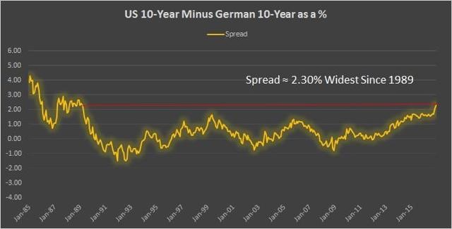 与此同时,全球债券收益率的差距也愈来愈大。当前,美国10年期国债收益率为2.55%,德国国库券收益率为0.25%,收益差接近2.3%,创下近30年来新高。