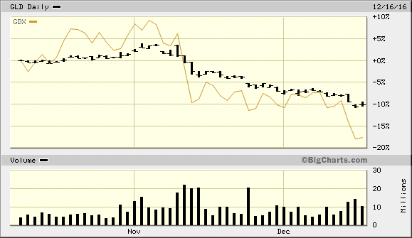 接下来我们来分析自特朗普当选以来黄金ETF(GLD)与黄金矿企股ETF (NYSEARCA:GDX)的表现。GDX自大选以来跌幅是GLD的两倍。GLD下跌10%左右,而GDX下跌20%。综合考虑美国股市近来的整体表现,这样的跌幅显然是非常让人吃惊的。投资黄金的个人投资者亦如GDX一般遭受重创,但是在黄金处于如此有吸引力同时看似极具风险的环境下,笔者仍然坚信挑选一只与黄金相关的个股是当前的最佳策略。