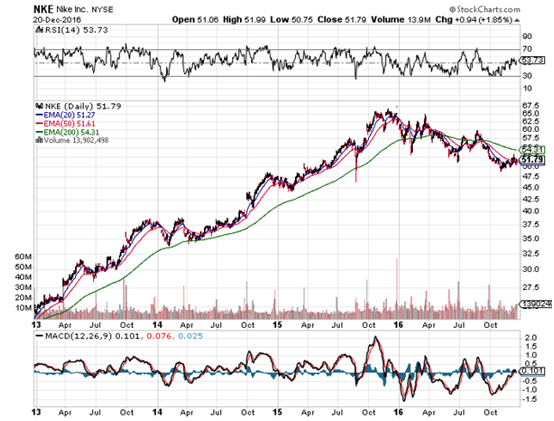 首先从K线上来看,很难说耐克是超过预期的。过去四年来,公司股价飙升,目前市值为850亿美元;现在大约53美元的价格距离前高68美元也相差不大。但是,公司在营收方面表现一般,相比于业内的阿迪达斯、安德玛,耐克的增长仅维持在个位数。