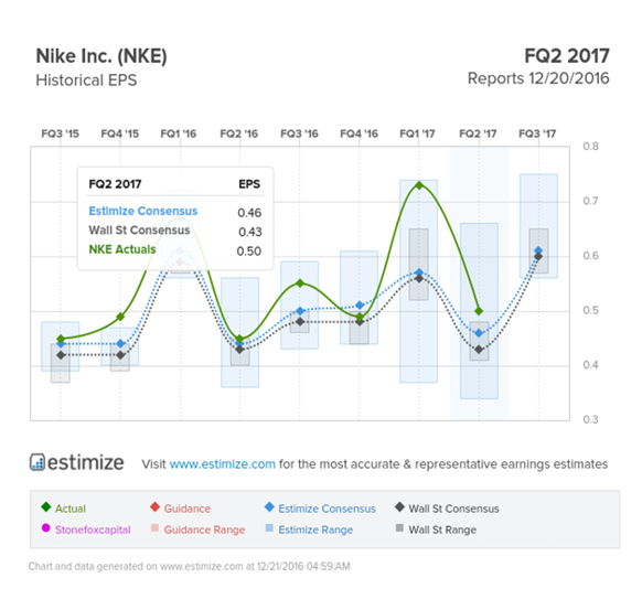 而在90天前,有分析师预测其EPS会是0.52美元,因此这也大大降低了“超出预期”的程度。以下是Estimize提供的季度趋势分析,通过图表可知,华尔街预测EPS为0.43美元,耐克实际为0.50美元,而Estimize就预测为0.46美元。虽然近两年耐克在业绩指引上运用了很多技巧,但结果却都表现平平。