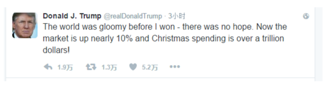 候任总统特朗普的自信心更是爆了棚,并开始给自己脸上贴金了。他昨日一早就发Twitter称:“在我胜选前,全世界一片阴霾,毫无希望。而现在,股市飙涨10%,圣诞消费额超过万亿美元!”