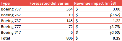 笔者认为相比2016年,2017年波音777总交付量降低近20架,这将导致波音777的营收同比降低27亿美元。