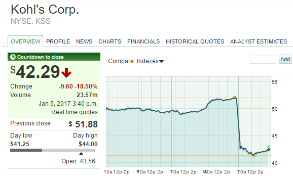 尽管假日季消费热情高涨,科尔士百货公司(纽交所:KSS)在发布公司11月和12月的下滑业绩后,周五股价盘后重挫。疲软的假日季业绩令人担忧,同时必定引发抛售热潮。然而,笔者认为KSS重挫后的当前股价仍估值过高,未来仍存在下行趋势,建议有意买入该公司股份的投资者观望一段时间后再入场。