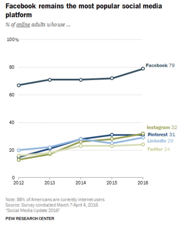 以Facebook等社交媒体为代表的新媒体市场占有率在逐渐上升,Facebook依旧是目前最流行的社交媒体。eMarketer估测2016年Facebook获得社交媒体上广告份额的67.9%。