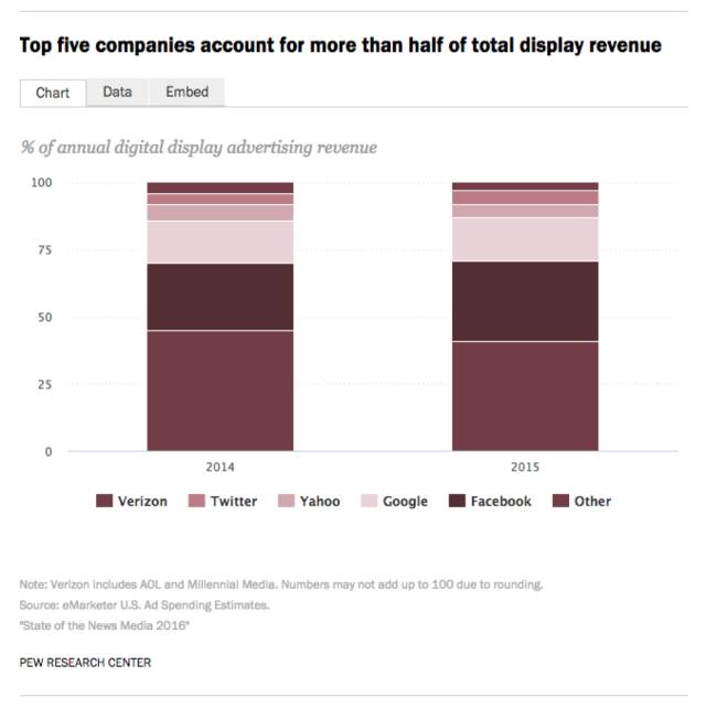 皮尤指出:“与一年前相比,数字广告营收中更大的一块蛋糕,即 65%,被 5 家科技公司所占有。这些公司都不是新闻机构,但其中一些公司,包括 Facebook、谷歌、雅虎和 Twitter,正在将新闻集成至它们的产品。”