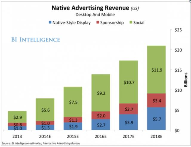 在The Atlantic以及Mashable首先试水之后,原生广告在2013年迅速蹿红。接着《纽约时报》、《华盛顿邮报》以及《华尔街日报》都配备专门团队来负责原生广告,所谓的“定制内容部门”。