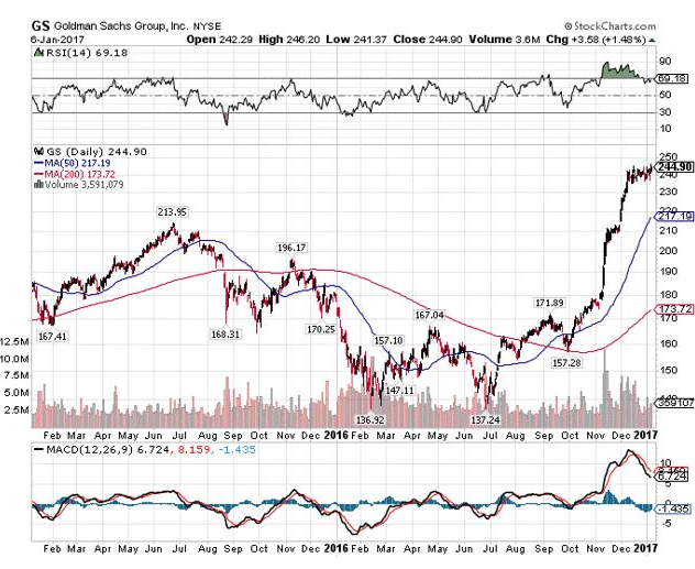 自美国大选以来,高盛(NYSE:GS)股价暴涨。显然特朗普所提议的经济措施使高盛获益良多,投资者也纷纷买入该股。随着收益渐增,高盛看似不大可能保持当前势头继续上涨。从下表容易看出,高盛股价陡涨了约90美元。但由于高盛的预期远高于此,而且据计算,它的2017年收益只会增加12倍,因此笔者认为当前高盛股价被大大低估了。