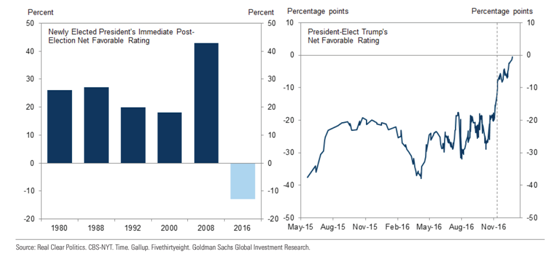 图:特朗普虽然在当选时的支持率属历届总统最低,但支持率却在快速改善