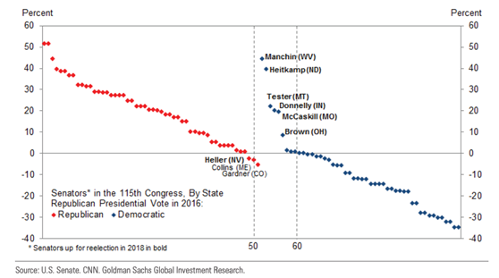 另外,国会中民主党议员有多少人愿意支持共和党和特朗普的政策议程也是个未知数。当然,有理由相信民主党会支持某些政策议题,而且在2018年参议院民主党议员选举中,有数个席位将来自于在大选中支持特朗普的州。