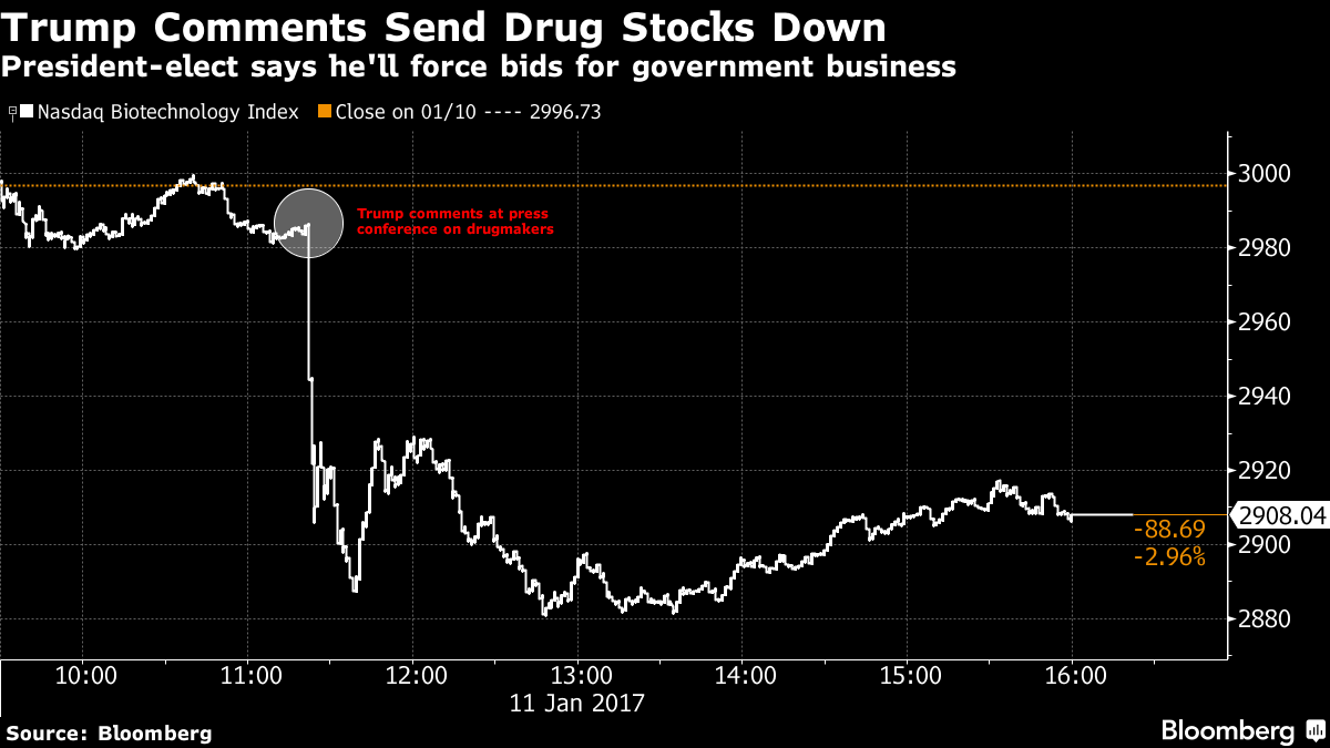 投资者曾认定特朗普将会利好制药行业,而制药股与生物科技股在特朗普当选之后确实曾一度上涨,但从目前来看,特朗普很可能接下民主党在竞选时的大旗,着手解决对许多美国人民的腰包造成负担的药品价格问题。