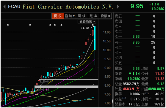 周四,菲亚特克莱斯勒股价大跌10.28%,报9.95。