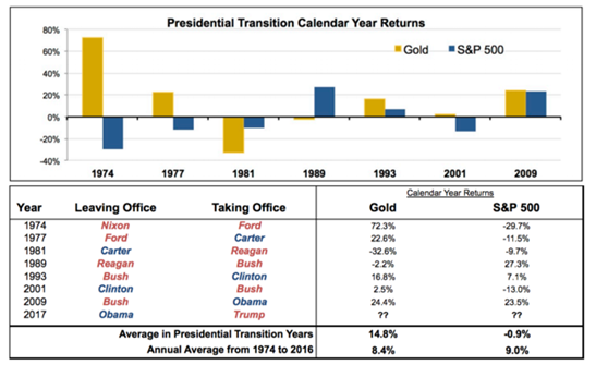 随着特朗普继任总统的脚步越来越近,黄金将如何表现成为一个投资者都关心的话题。通过Merk Investments的历史回顾,将为投资者在新的总统上任年份如何在投资组合中配置黄金资产提供一些参考。