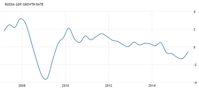 2)俄罗斯总体经济自2011年以来已经进入减速通道。GDP一直在降,但2015年以后情况加速恶化,GDP增速最低降到接近-2%,通胀10%以上,总体居民收入下降10%以上。整个俄罗斯国内弥漫着对经济形势的悲观气氛。相对地,外国投资者对于投资俄罗斯也依然十分谨慎,戏称为“勇敢者的游戏”。