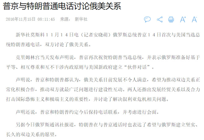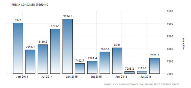 6)另外,近期随着Trump的上台,很多观察家都对俄罗斯前景抱有新的希望。众所周知,Trump本人十分看好俄罗斯,近年还和当地土豪合作开发地产项目。而他和普京的关系据江湖传闻听说也一直不错。在这个背景下,有人开始期望对俄罗斯的制裁将有希望被解除。当然,Trump很难凭一人之力改变整个国际大局势。对俄罗斯而言,制裁是经过各国一致同意,一起签了备忘录的。如果俄罗斯不停止对乌克兰的干预,美国很难有理由停止对俄罗斯的制裁;如果硬推,必将遭到国际社会的强烈抵制。但鉴于普京和Trump的关系,说不定会有外交斡旋的空间,由俄罗斯形式上做出一定让步也未免不可能。这些都是猜想,但Trump的上台给了我们极大的猜想空间。
