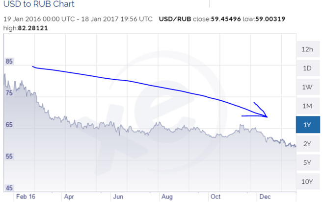 5)但是,近期俄罗斯宏观经济有慢慢稳定的迹象,特别是卢布升值、石油回升所带来的红利,相信会慢慢传递到俄罗斯的大众消费者身上。卢布从对美元1:80升值将近1:60,对以卢布计价的美国上市公司也是一个直接提振。2016年随着石油价格更是强势反弹,从年初30多到目前的50。这里不再详述。