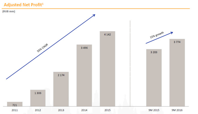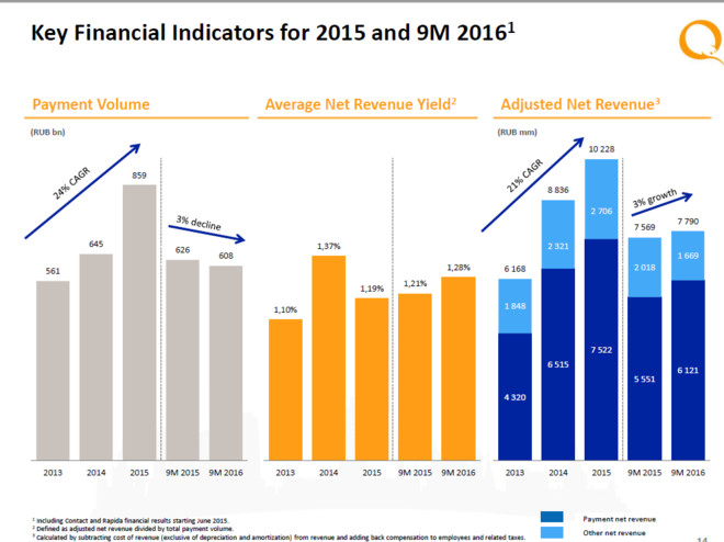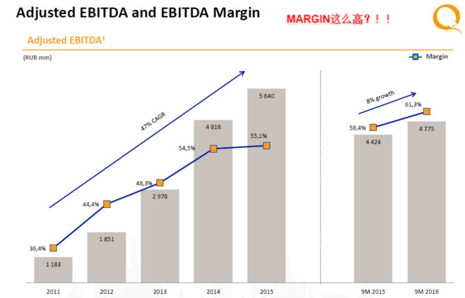 2)虽然QIWI今年业绩不论从总体营收还是利润上都表现不佳,但乱世之中也算稳住了阵脚。营收总体微增3~5%左右,利润下降50%,但利润下降里将近一半的原因是外汇损失。利润绝对值依然为正,分红也没断。另外,adjusted EBITA在2016年前9个月甚至比15年有15%的增长。(当然利润是经调整的,会计上也许有水分) 毕竟这是在如此恶劣的市场环境下取得的成绩。