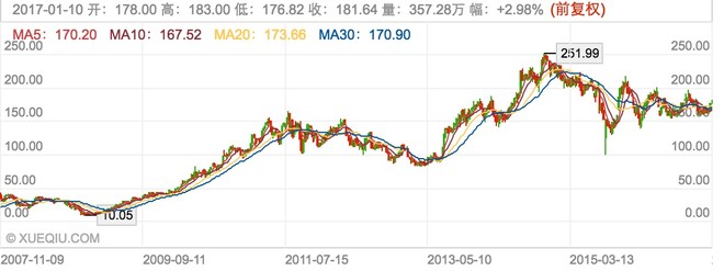 百度经济危机后到11年上涨超过10倍。2011后因为移动端的全面崛起,股价蛰伏了整整两年时间。2013年8月宣布收购91手机助手后,业务在移动端安装量快速上升,虽然移动端渗透率不可和腾讯,阿里同日而语。但好歹也算半吊子上了车。16年三季度的公布移动端月活跃用户6.6亿,同比增长3%。移动地图用户月活跃3.48亿,增长7%。百度的O2O服务的GMV按年增长49%,规模达到194亿人民币。但这块业务在投资者看来对业绩是负面贡献,O2O对利润的影响是-21.4%,爱奇艺对利润的影响是-7.7%。单是这两项对去年三季度报表的贡献是负8亿美金。