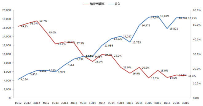 上图是百度从2012年Q1到2016年Q3的收入(蓝色)和利润率(红色)走势图。李彦宏曾经说过海外投资者不理解百度O2O业务的价值,但投资者看得懂财务报表啊,经过几年的“悉心运营”百度在财务上写了个大“×”。