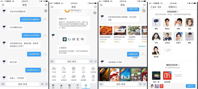 百度的语音识别,已经不是简单的分辨词语,对语意和用户目的的领悟并产生回馈才提供真正的价值。上图在度秘APP中,全都是使用语音问答,可以聊天,打车,看电影,查天气,起床唤醒(并设置自己喜欢的明星语音),提供将近50个服务。在语意理解上度秘可以回答出“赵本山老婆属相是什么”这种拐弯抹角的问题。而马上百度会发布度秘版的对话机器人,并且搭载DuerOS人工智能操作系统。这就是中国版本的ECHO。