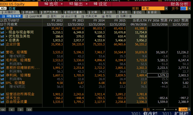当前百度的搜索业务估值只有13倍。O2O和视频对估值的贡献最少是负的300亿美金(按照Google估值x百度没有O2O和视频的假设利润-百度当前市值),百度2012年的利润率45%,股价中位数全年在130美金。经过4年收入翻了差不多三倍,而利润反而比2012年低。过去的2016年股价中位数在175美金。而且华尔街对其未来的预期还是一个非常糟糕的状态,主要就是O2O业务的无底洞,让投资者看不到业务上迎来曙光的那一天。但曙光也许会以另一种方式出现,比如像处理去哪儿网一样。