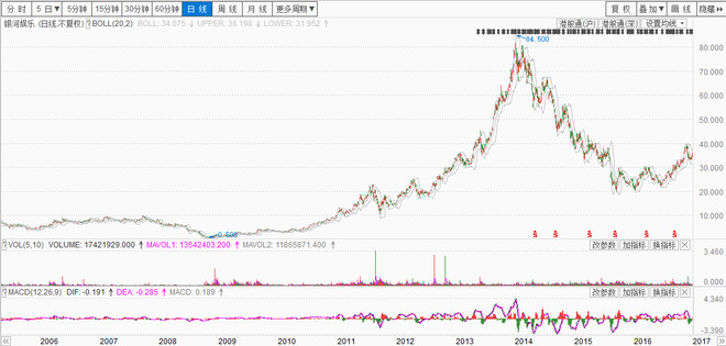 澳门博彩业近10多年的发展情况,其实从银娱的股价走势就可见一斑。这些年正是中国内地经济发展极为迅速的阶段,而当内地居民基本收入实现快速增长时,势必会通过消费、消遣来满足自身精神层面的需求,赌博就是其中的一个重要消遣项目。从2005年后的10年间,澳门博彩业收入从最开始的500亿元大幅提升至3500亿元,年复合增长率超过30%。银河娱乐在这期间,也从08年的低点0.5元攀升至了14年的最高点84.5元,实现百余倍的增长。不过从14年开始,政策风险开始显现,国内反腐力度的加强,这三年行业衰落明显。内地游客持续减少,营业收入下滑严重,随之而来的就是博彩业公司股价出现大幅下滑。银河娱乐从高点一直跌至15年9月的19.02元,才宣告暂时企稳。近日,随着国内外汇管制的趋紧,各项限制政策陆续出台,博彩业板块再次变得风声鹤唳,自12月起接连出现单日大跌的情况。
